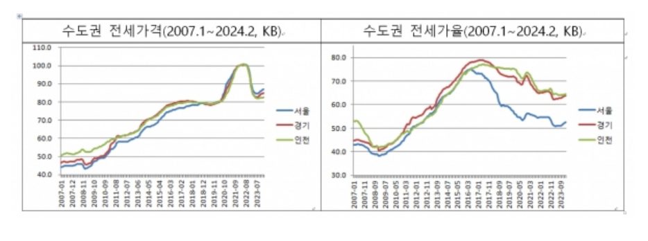 수도권을 예를 들어 설명하면 가격상승의 기대가 낮았던 2008년 금융위기 시점부터 장기 침체 후 매매가격의 상승이 나타나는 2015년 이전까지는 지속적으로 서울, 경기, 인천의 전세가율이 상승했다. 즉, 이 시기는 매매가격 상승의 기대가 거의 없었다.