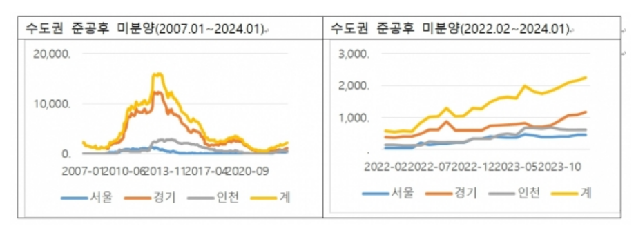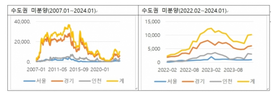 다음은 수도권 기준으로 장기간 미분양의 추이와 최근 2년의 자료이다
